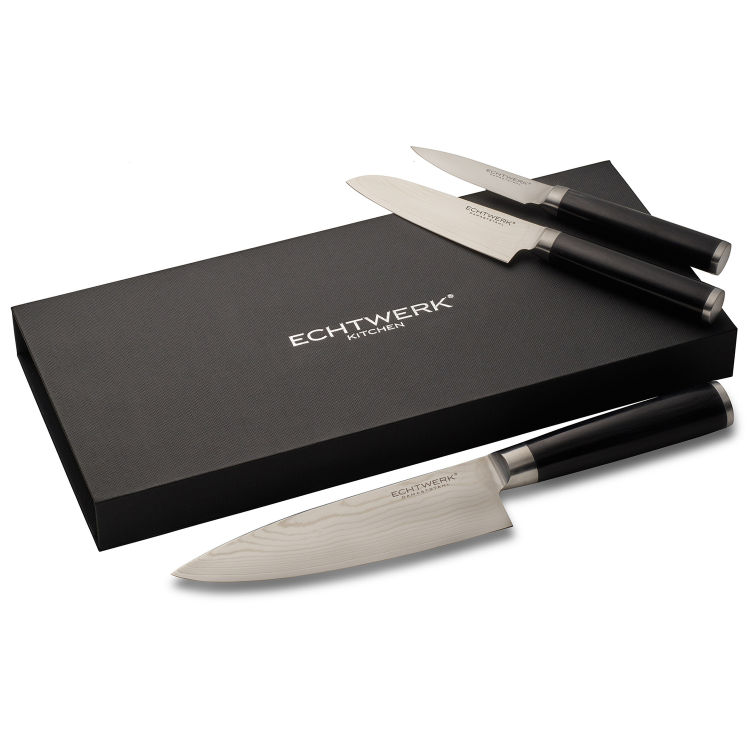 Vielseitigkeit des Sets: Das Set umfasst drei verschiedene Messertypen - Kochmesser/Küchenmesser, kleines Santokumesser/japanisches Messer und Schälmesser/Gemüsemesser. Diese Vielseitigkeit ermöglicht es, eine breite Palette von Schneidaufgaben in der Küche zu bewältigen.