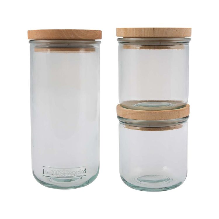 In diesen Aufbewahrungsgläsern sind Zucker, Salz, Körner und Co. perfekt untergebracht. Die Vorratsbehälter sind aus Recyclingglas hergestellt und überzeugen mit ihrer hochwertigen Qualität. Der Holzdeckel mit Dichtung schließt hervorragend, sodass der Inhalt lange frisch bleibt. Das Beste: Die Vorratsgläser können gestapelt werden. Dadurch brauchen sie nur wenig Platz im Schrank! Das 3er-Set besteht aus zwei Gläsern mit 0,35 l Volumen und einem Glas mit 0,82 l Volumen.