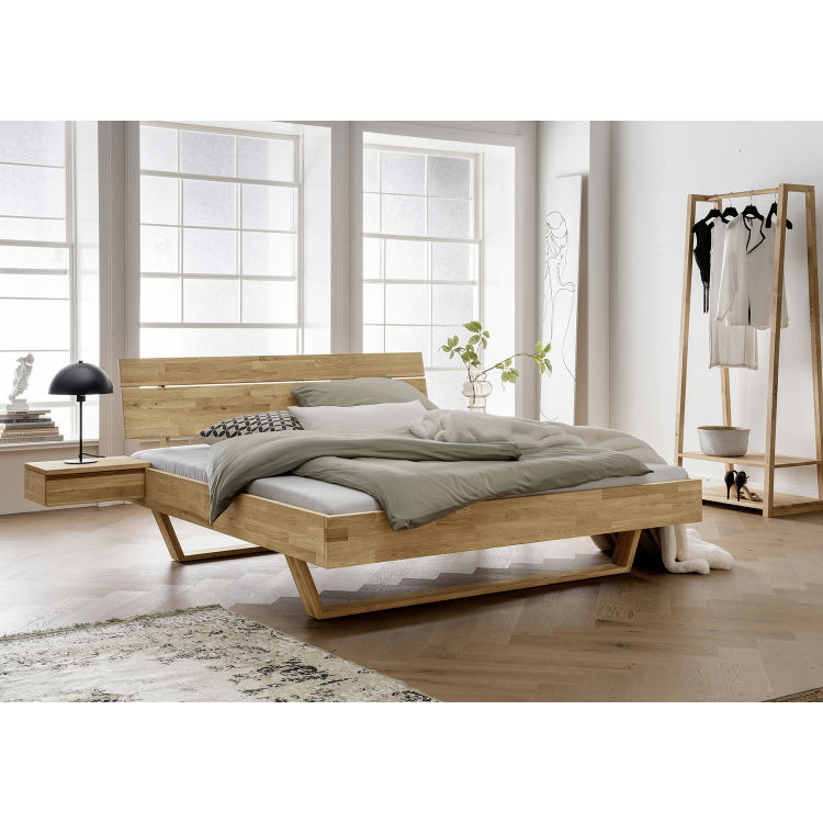 Natürlich, schick und modern: All diese Eigenschaften und noch vieles mehr bringt dieses Massivholzbett mit. Die Wildeiche wirkt sehr harmonisch und ist mit ihrer lebendigen Maserung immer ein Blickfang. Das Bett mit praktischem Kopfteil zum Anlehnen ist parkettverleimt, was ihm eine abwechslungsreiche Optik verleiht. Vorteil dieser Art der Verleimung ist auch, dass der ganze Baum verwendet werden kann. Das Gestell steht auf den Holzkufen ausgesprochen stabil. Die Kufen sorgen dafür, dass unter dem Bett viel Stauraum ist. Außerdem wirken sie modern. Das Bett ist in unterschiedlichen Größen erhältlich. Hinweis: Matratze und Lattenrost sind NICHT im Lieferumfang enthalten.