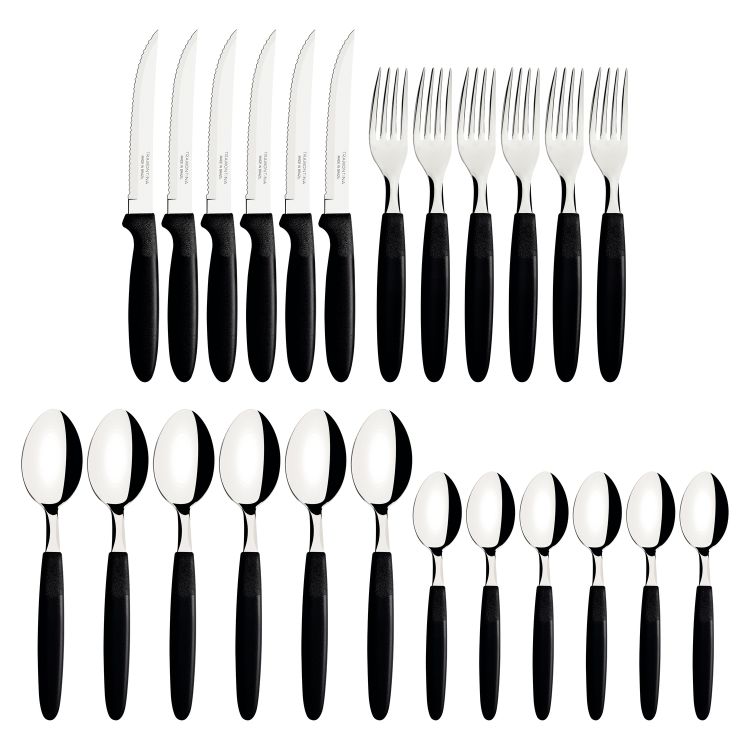 Mit dem IPANEMA Besteckset für 6 Personen erhalten Sie die perfekte Kombination aus Funktionalität, Langlebigkeit und stilvollem Design. Das Set für sechs Personen besteht aus jeweils sechs Steakmessern, Gabeln, Löffeln und Kaffeelöffeln und ist ideal für den täglichen Gebrauch, ob im Alltag, für gesellige Abende mit Freunden oder beim Camping. Die Besteckteile bestehen aus hochwertigem, rostfreiem Edelstahl, der für Robustheit und lange Haltbarkeit sorgt. Ergänzt wird das Set durch ergonomisch geformte Kunststoffgriffe, die angenehm in der Hand liegen und eine komfortable Nutzung ermöglichen. Die Steakmesser mit scharfem Wellenschliff garantieren präzises und müheloses Schneiden, während die schlichten, eleganten Gabeln und Löffel für eine harmonische Tischgestaltung sorgen.