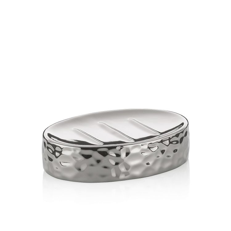 Extravagant und schick: die silberne Seifenschale Sterling aus Keramik mitsilberner Oberfläche. Mit erhöhten Rillen, damit die Seife trocken liegt. DieSeifenschale hat eine Länge von 12 cm und ist 3,5 cm hoch.