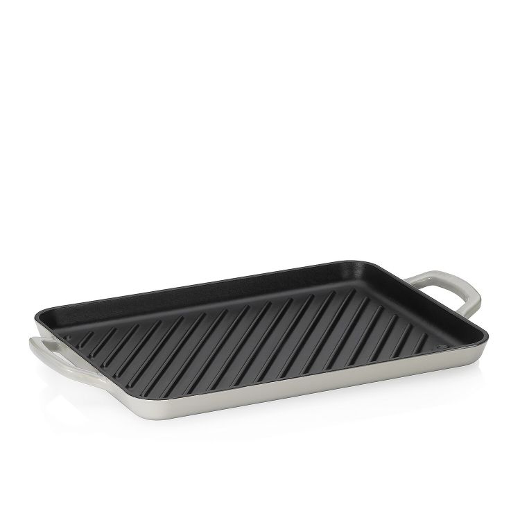 Für gemütliche, festliche Abende bestens geeignet. Einfach mal ein besonderes Grillerlebnis mit Freunden oder der Familie im Haus erleben. Diese Grillplatte besteht aus Gusseisen. Außen ist sie hellgrau, in glänzender Optik und innen ist sie ausgestattet mit einer schwarzen, rauen Emaillierung und einer Oberfläche, welche die typischen Grillstreifen erzeugt. Maße: 35 x 25 x 2cm. Temperaturbeständig bis zu 300°.