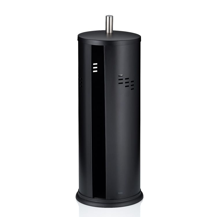 Für den Toilettenpapier-Nachschub: der Toilettenpapierbehälter SWING aus Metall in der Farbe schwarz, für bis zu 3 WC-Papierrollen. Die seitliche Öffnung ermöglicht das einfache Entnehmen und Befüllen des Toilettenpapiers. Der Toilettenpapierbehälter hat einen Durchmesser von 14,5 cm und ist 39,5 cm hoch.