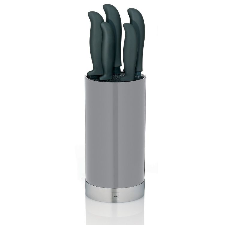 Praktisch und stilvoll zugleich: der Messerblock Acida von Kela. Er beinhaltet 5 verschiedene, qualitativ hochwertige Messer, von klein bis groß, die aus Edelstahl gefertigt sind. Der Messerblock ist aus grauem PP-Kunststoff. Dieser hat zudem ein praktisches Innenleben, das zum Reinigen einfach herausnehmbar ist. Die Messer sind durch dünne Kunststoff-Streifen im Messerblock voneinander getrennt und können somit nicht so leicht verkratzen. Maße: 22,5 cm h, 11 cm Ø. Der Behälter ist in 3 Farben erhältlich.