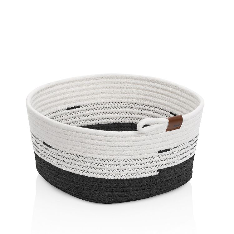 Da macht Ordnung halten und Aufräumen Spaß: Schwarz/Weißer Aufbewahrungskorb aus Mischfaser - aus der Serie Hedda von kela. Der vielseitig einsetzbare und robuste Korb in geflochtener Optik hat die Maße: 18 cm Ø und 17 cm hoch.