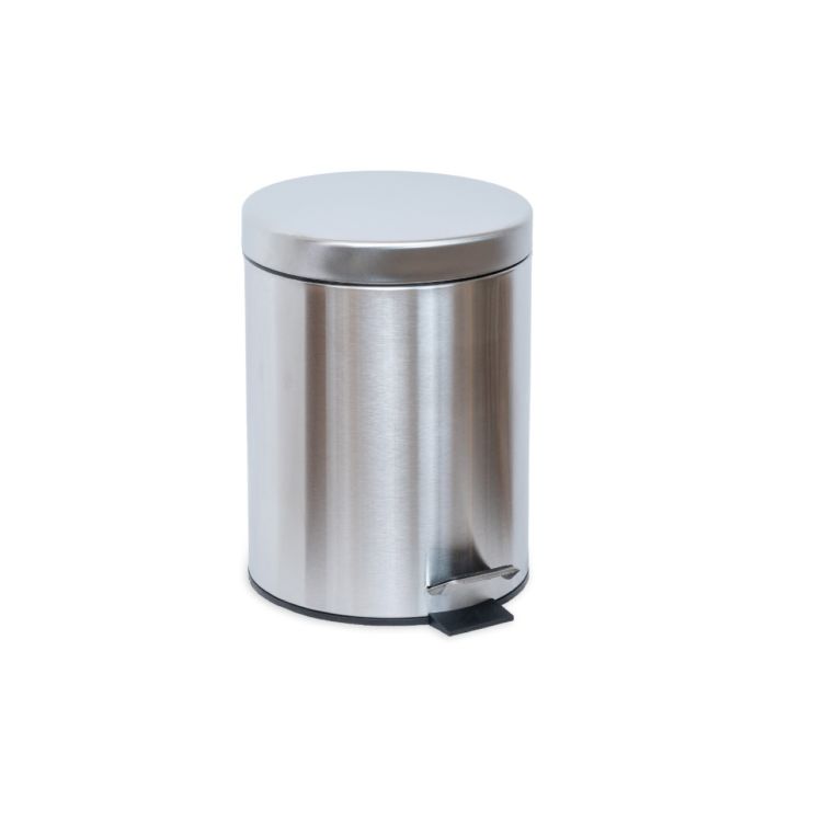 Hochwertiger Kosmetikeimer aus mattem Edelstahl (5 Liter) mit herausnehmbarem Innenbehälter aus Kunststoff, Tretfunktion und Soft-Close-Senkautomatik. Geruchsdicht, hygienisch und leise im Gebrauch – perfekt für Bad oder Gäste-WC.