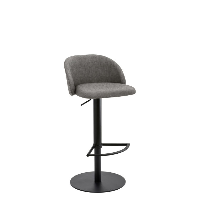 Gestell schwarz, Sitz und Rücken gepolstert, 360° Drehmöglichkeit, stufenlose Höhenverstellung durch Gasfeder, Design-Fußstütze, belastbar bis 120 kg, Sitzhöhe 54-79 cm. Hochwertiger, angenehm weicher und atmungsaktiver Polsterstoff hergestellt aus 100 % recycelten PET-Flaschen.