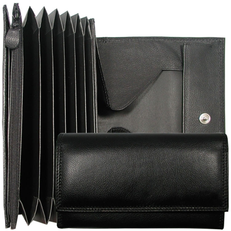 6 Notenfächer XL , 1 Münzfach mit Schüttrand, 2 Steckfächer, 1 Reissverschlussfach, 1 Steckfach aussen, 2 Druckknöpfe (Marke Prym), Doppelsteppung mit Koban-Faden
