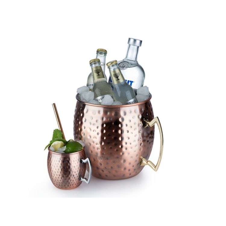 Der Flaschenkühler von Buddy’s Bar in Moscow Mule Becher Optik setzt ein markantes Highlight im Bar- und Eventbereich. Gefertigt aus hochwertigem Edelstahl überzeugt er durch Stabilität, Langlebigkeit und eine professionelle Anmutung. Die gehämmerte Oberfläche im charakteristischen Antik-Kupfer-Look verleiht dem Kühler eine ausdrucksstarke Struktur und unterstreicht das authentische Bar-Ambiente. Ideal zur stilvollen Präsentation und Kühlung mehrerer Flaschen oder Getränke bei Veranstaltungen, im Gastronomiebereich oder im privaten Rahmen. Die robuste Verarbeitung sorgt für einen sicheren Stand und eine zuverlässige Nutzung im Servicealltag. Für den langfristigen Erhalt der Oberfläche wird eine schonende Reinigung per Hand empfohlen.
