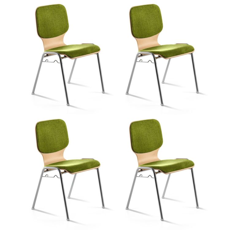 Stapelstuhl mit Holzsitz buchefarbig, Gestell verchromter Stahl, Sitz und Rücken gepolstert, inkl. Reihenverbinder, stapelbar (max. 10 Stühle), belastbar bis 100 kg, Sitzhöhe 46 cm. Bezugsstoff in Kiwigrün: pflegefreundliches und strapazierfähiges Flachgewebe aus 100 % Polyester, Scheuertouren nach Martindale 100.000, Pilling 4-5, Lichtechtheit 4, Flammschutz nach DIN EN 1021-1.