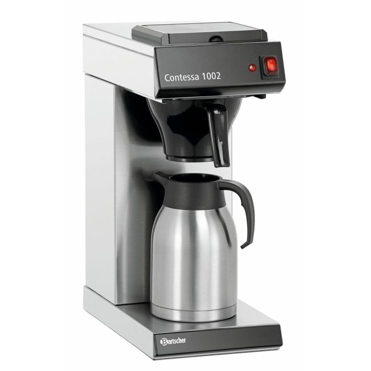 Máquina de café con jarra isotérmica y placa caliente en la parte superior. Carcasa de acero inoxidable 18/10, inoxidable. Cesta para filtro de plástico. Jarra con doble aislamiento de acero inoxidable 18/0 mate, con tapadera de plástico y un sistema automático para manejar con una sola mano, no apta para lavavajillas. Adecuado para un uso continuo. Con un interruptor de encendido/apagado para la cafetera para la cafetera y una luz indicadora de calentamiento. Tiempo de preparación aprox. 8 minutos. Capacidad mínima 0,5 litros. Incluye jarra isotérmica. Dos años de garantía. Potencia: 2 kW/230 V; capacidad jarra: 2 litros; ØxAt jarra cm: 14x25; capacidad horaria: aprox. 16 litros; peso: 6,8 kg.