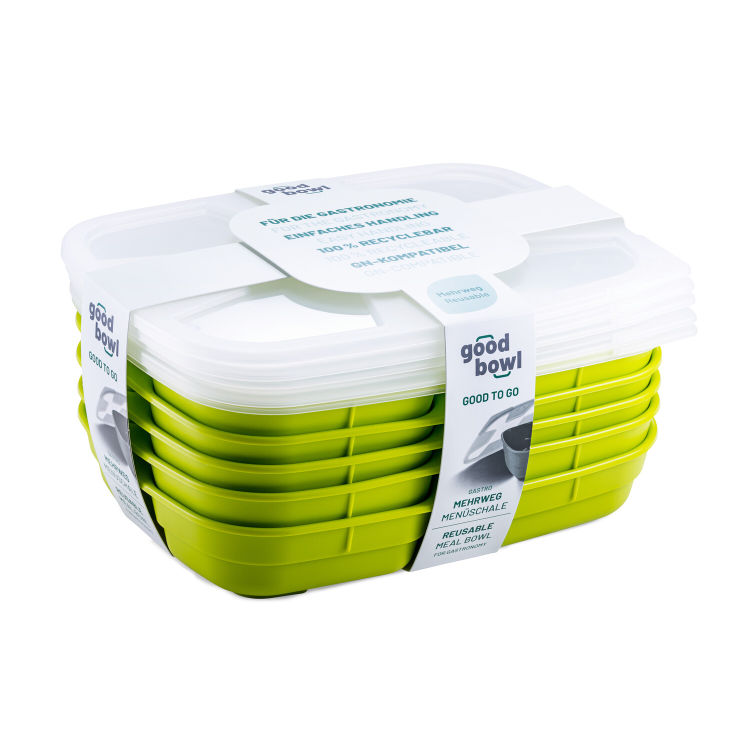 La boîte repas réutilisable à 3 compartiments (580 ml + 2 x 220 ml) avec couvercle est composée de polypropylène recyclable. Elle résiste à des températures comprises entre -10 °C et +100 °C. Empilable et étanche, elle passe au lave-vaisselle et au micro-ondes. Forme très pratique pour optimiser le transport dans les sacs de livraison ou les caisses de transport.