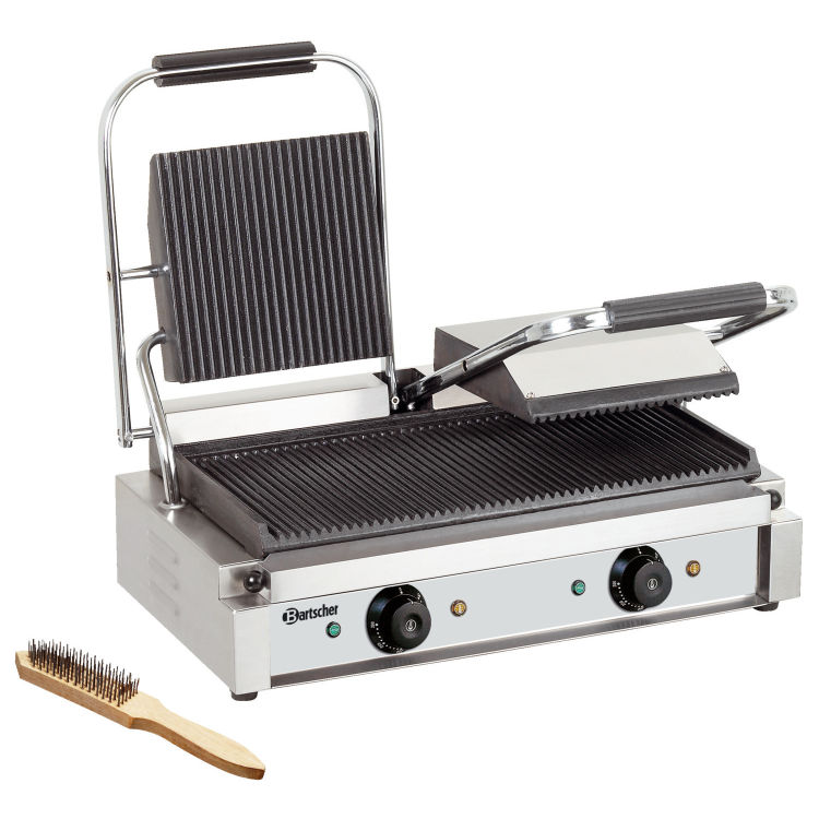---Gril contact double avec bâti en acier inoxydable. Plaques rainurées pour un transfert de chaleur optimal. Deux thermostats réglables séparément de 50 °C à 300 °C, voyant lumineux de chauffe, voyant marche/arrêt, lèchefrite. Livré avec brosse de nettoyage. Garanti 2 ans. Plaques supérieures 215 x 215 mm (L x P); plaques inférieures 470 x 230 mm (L x P).
