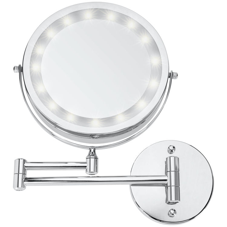 Miroir grossissant rond en métal chromé et en matière plastique avec éclairage LED. Fixation murale. D'un diamètre de 18 cm, il est inclinable et dispose d'un bras qui peut s'allonger jusqu'à 30 cm. Miroir pivotant avec 1 face miroir simple et 1 face miroir grossissant X 5. Les deux faces sont éclairées par des LED, avec fonction marche/arrêt sans fonction de variation. Convient aux pièces humides. Accroche murale de 11 cm de diamètre. Montage facile, set de fixation inclus. Alimentation avec 4 piles AAA de 1,5 V. Piles non incluses.