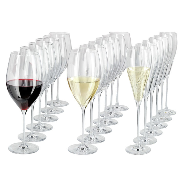 Set de 18 pièces composé de 6 verres à vin rouge, 6 verres à vin blanc et 6 flûtes. Verres en cristallin aux lignes élégantes. Passent au lave-vaisselle.