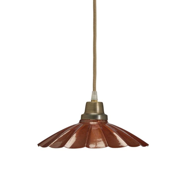 Petite suspension Ester en métal finition émaillée imitant le marbre. Chaque pièce est unique. Esprit vintage grâce à l'ajout de métal finition laiton. Finition terre cuite. Diamètre à la base : 24 cm, hauteur : 12 cm. Cordon textile beige lin de 3,5 m avec crochet de suspension et prise plate européenne. Culot E27, max. 25 W. IP20. Ampoule non incluse.