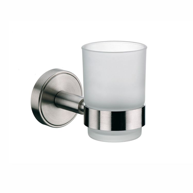 Peu encombrant et élégant, le porte-brosses à dents Marbea se fixe au mur. Le support est en acier inoxydable brossé et le gobelet amovible est en verre satiné. Le diamètre du porte-brosses à dents est de 6,5 cm.