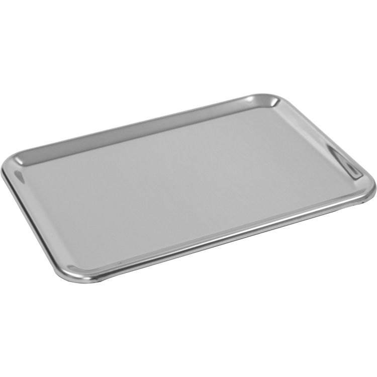 Plateau de présentation en inox poli. Avec bord rabattu.