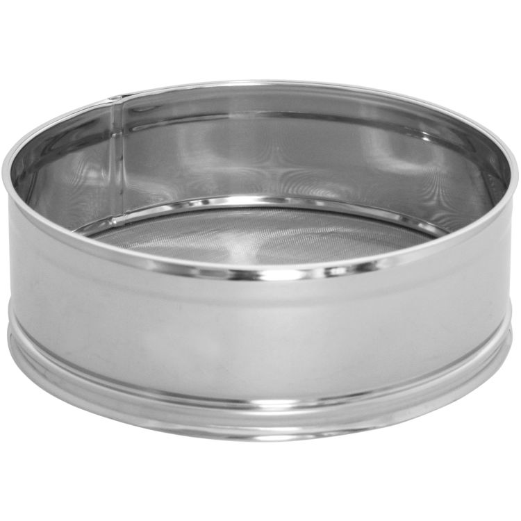 Tamis à farine en inox. Maille fine (0,3 mm). Convient pour les produits secs à tamiser.
