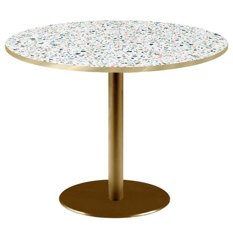 • Table pour restaurants, brasseries, bars ou collectivités, pour usage intérieur • Cet article existe aussi en 70x70cm ainsi qu'en mange-debout Ø60cm et 60x60cm• produit européen de grande qualité et finitions soignées: • plateau fabriqué en France, pied fabriqué en Italie • piétement en fonte thermolaquée - doré métal• plateau en bois aggloméré avec placage en stratifié et chants en PVC couleur laiton• Piétement: base Ø60cm, colonne Ø7.6cm, poids 21kg, h73cm • Fourni avec tampons de réglage pour sols irréguliers • Plateau: Ø120cm, épaisseur 2,9cm, poids 20kg, capacité 5/6 couverts • Face inférieure du plateau en mélaminé blanc • Plateau pré-percé avec inserts pour une parfaite fixation au piétement • Livré en kit, montage facile, visserie fournie • Matériau très demandé en restauration collective pour ses qualités: hygiène et résistance • Entretien facile: nettoyage à l'eau légèrement savonnée ou désinfectant doux, sans détergent ni abrasif • Produit 100% européen • Pour une demande personnalisée, contactez-nous! Par exemple pour des plateaux ronds, ou bien des tables rectangulaires assorties, etc...