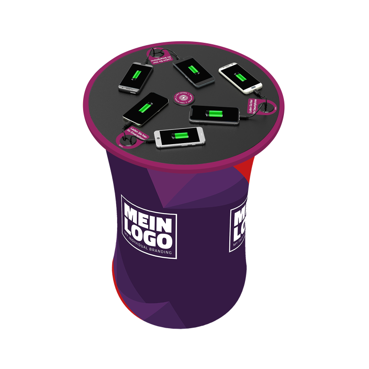 questo tavolo è molto più di un classico tavolo alto: è un punto di servizio mobile con valore aggiunto integrato. Grazie alla combinazione di possibilità di ricarica integrate per smartphone e ampia superficie pubblicitaria con il design desiderato, è la soluzione perfetta per impieghi temporanei, dalle fiere agli eventi.