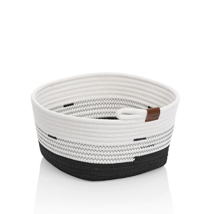 Mantenere l'ordine e riordinare diventa divertente: cesto portaoggetti bianco/nero in fibra mista - della serie Hedda di kela. Il cesto versatile e robusto dall'aspetto intrecciato ha le seguenti dimensioni: 18 cm di diametro e 17 cm di altezza.