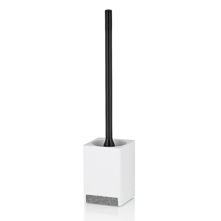 Elegante accessorio da bagno in nero: il set WC Cube è realizzato in plastica nera di facile manutenzione in combinazione con elementi in legno di quercia. Anche il manico dello scopino è nero e in plastica. La testina nera dello scopino è sostituibile. Il set WC ha una base quadrata di 9,5 x 9,5 cm ed è alto 45,5 cm.