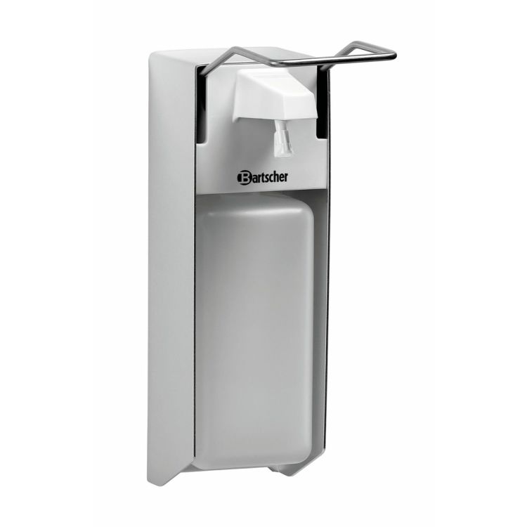 Dispenser for desinfeksjonsmiddel i aluminium. Enkel å bruke på en hygienisk måte. Levert inkl. veggfeste og en gjennomsiktig påfyllingsflaske i polypropylen.